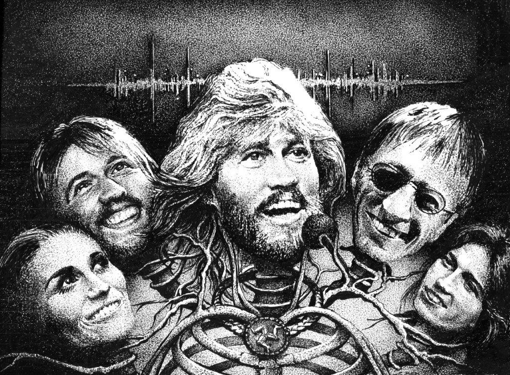 Here the arteries and veins are giving life, together with the sound waves taken from their number "Staying Alive". Sir Barry is also known for his love of jewellery and is wearing the symbol of The Isle of Man, where they were born.