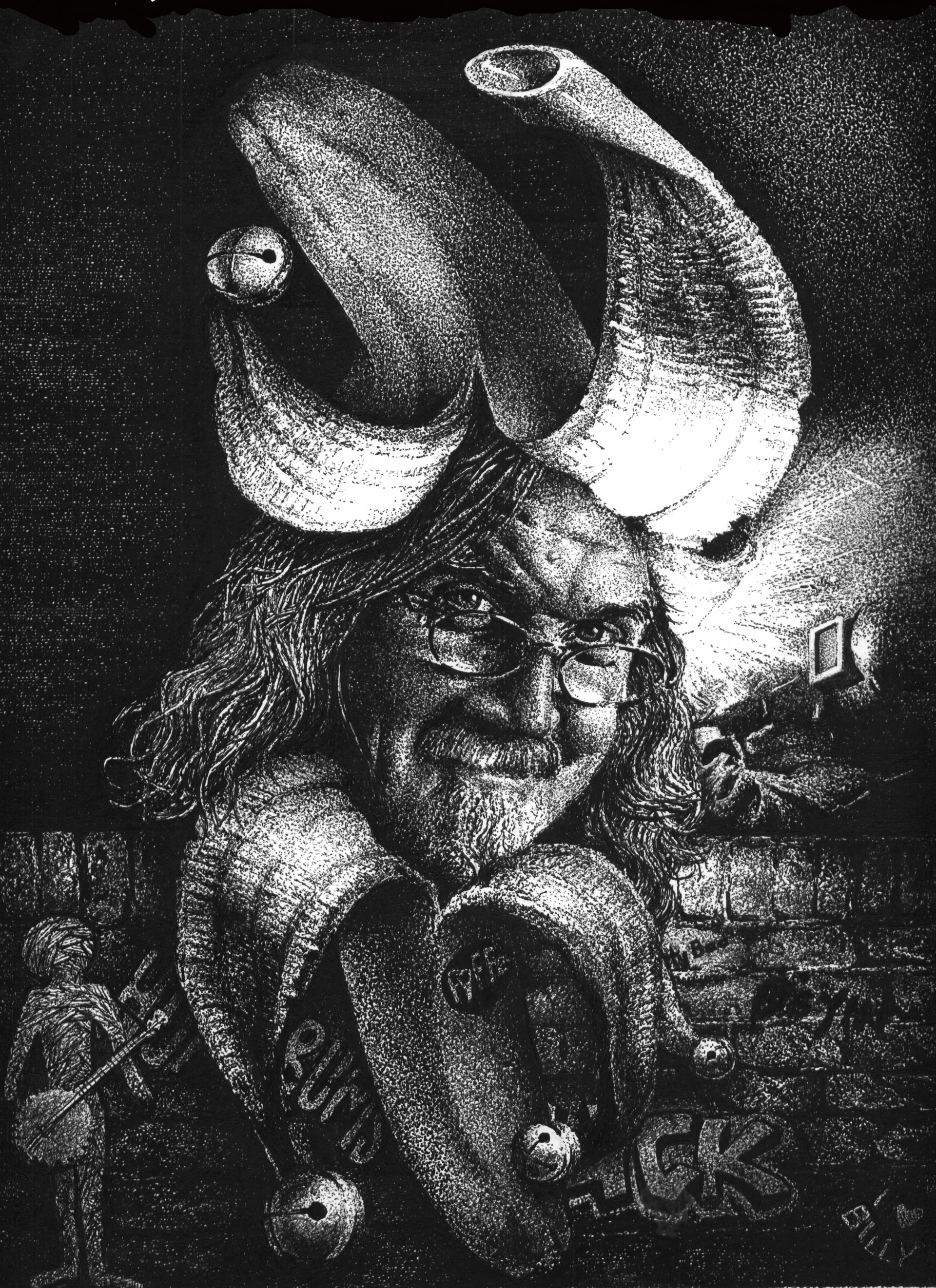 together with his famous "F" word. Also featured on the wall is a copy of a self portrait holding his banjo). The banana is a reminder of the banana boots he wore with added bells as he was sometimes referred to as Billy the Jester (with his stripey leggings), also a teapot spout which refers to his famous quote - "Never trust a man, who when left alone with a tea cosy ... doesn't try it on."