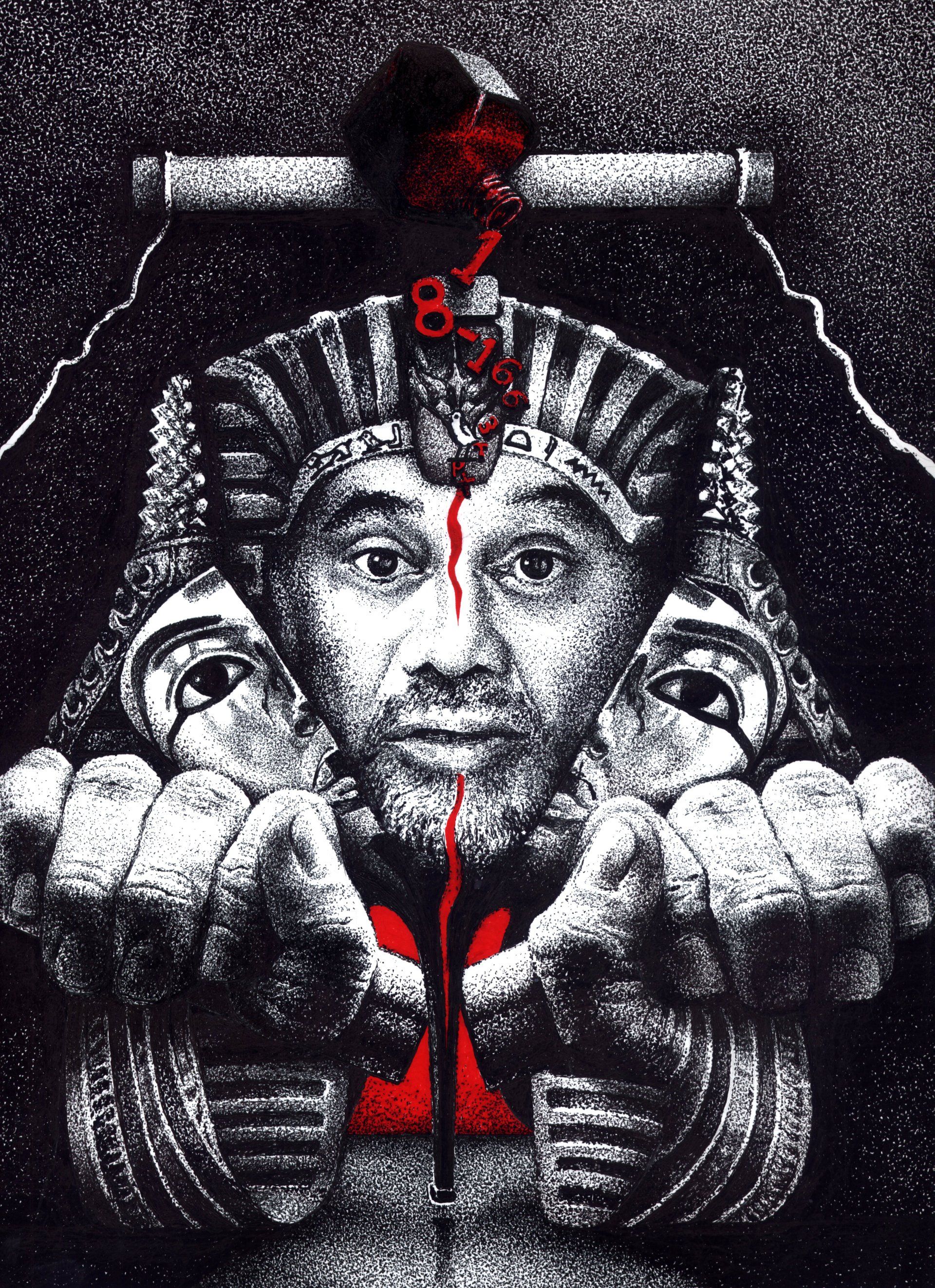 Analysis: Famous for his red soled shoes Louboutin is part Egyptian, hence the Sphinx portrayal. He has a trapeze in his studio which he uses. The red soles came about when he noticed a girl painting her nails with red nail varnish; he borrowed the varnish and painted the soles. Here we have a bottle of his nail varnish falling off the trapeze onto the shoe. The numbers are the pantone numbers of the shade of red which he always uses. The hieroglyphics spell out his name. There is also a pair of his shoes hidden.