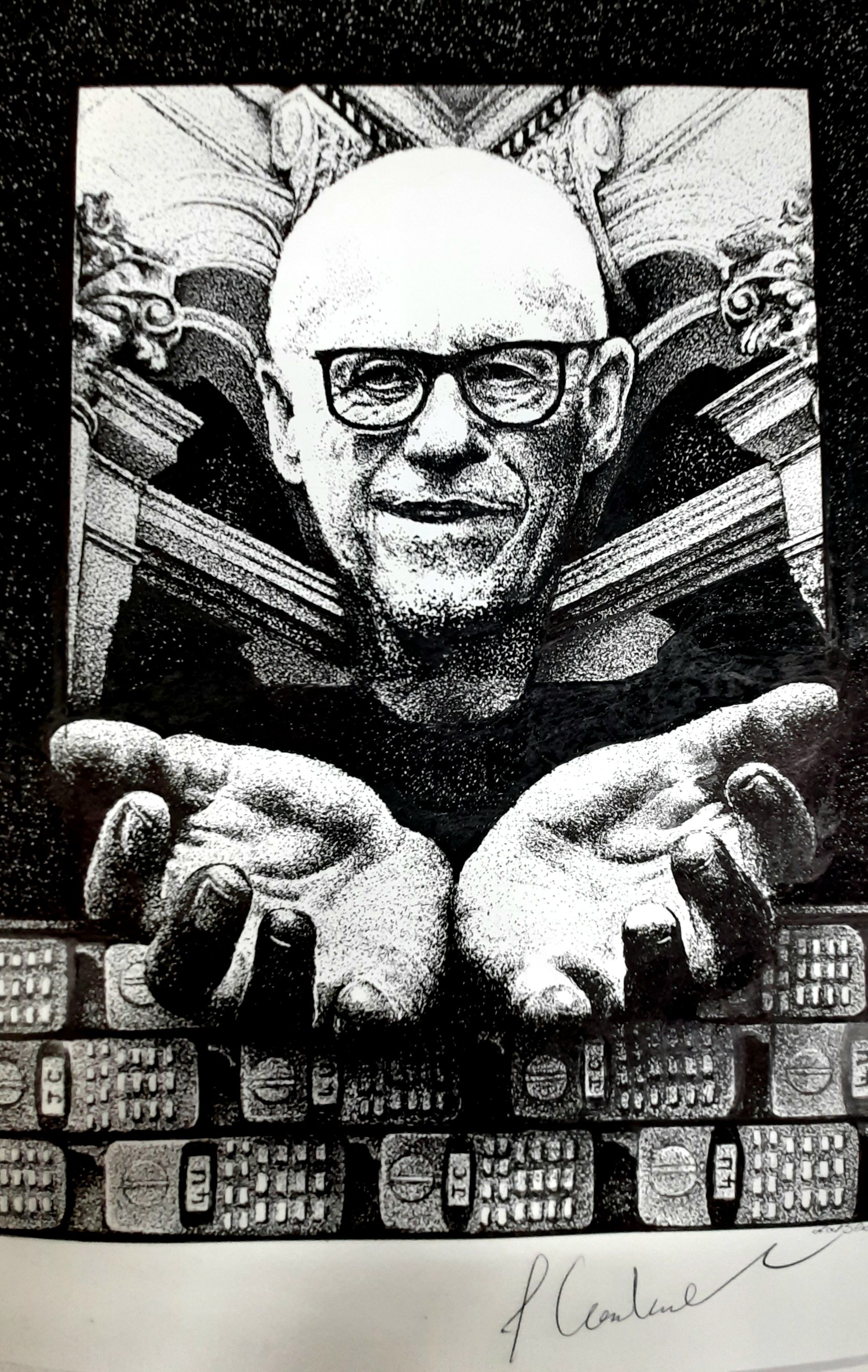 Analysis: My understanding is that the mobile phones played an important part in building his success so they have become the bricks, together with the architecture of his Mayfair home, representing his investment in real estate. Most importantly the hands emphasise the incredible amount of time and money he gives to charity.