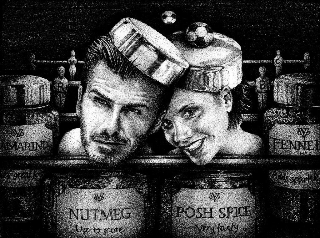 Analysis: Here is a spice rack which changes into table-top football with Brooklyn, Harper, Romeo and Cruz. There are 4 spices on the rack, Tamarind - one of their favourite Indian restaurants; Nutmeg - a football term; Posh Spice - could only be Lady Victoria and Fennel - Theo Fennell, the jeweller to the stars.