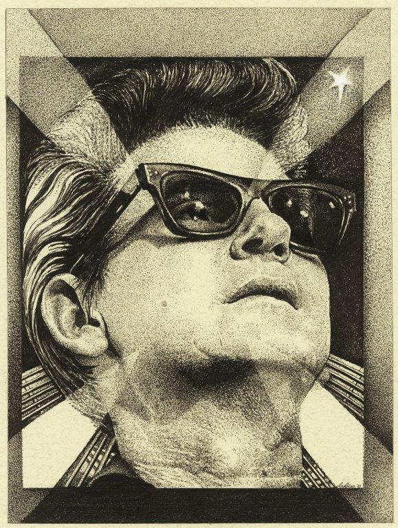 The picture was based on this cross. It has not been centred and the black back negative shapes, transform to become the positive shape of the cross, together with the fretwork from his guitar positioned towards his vocal chords. We are reminded of this talented Texan guitarist with his black hair, dark glasses and distinctive voice.