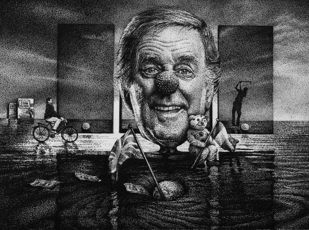 Analysis: Sir Terry Wogan the Irish radio and television broadcaster. Known for his involvement in the Red Nose Day with Pudsey Bear, his love of golf and cycling, his Breakfast Show, Wake Up to Wogan and the Eurovision Song Contest. Sir Terry is positiononed on the TV screen and either side are 2 speakers to represent the radio with volume control knobs. He is placed in the Irish Sea, between Ireland and the UK. The clues are all in the picture.